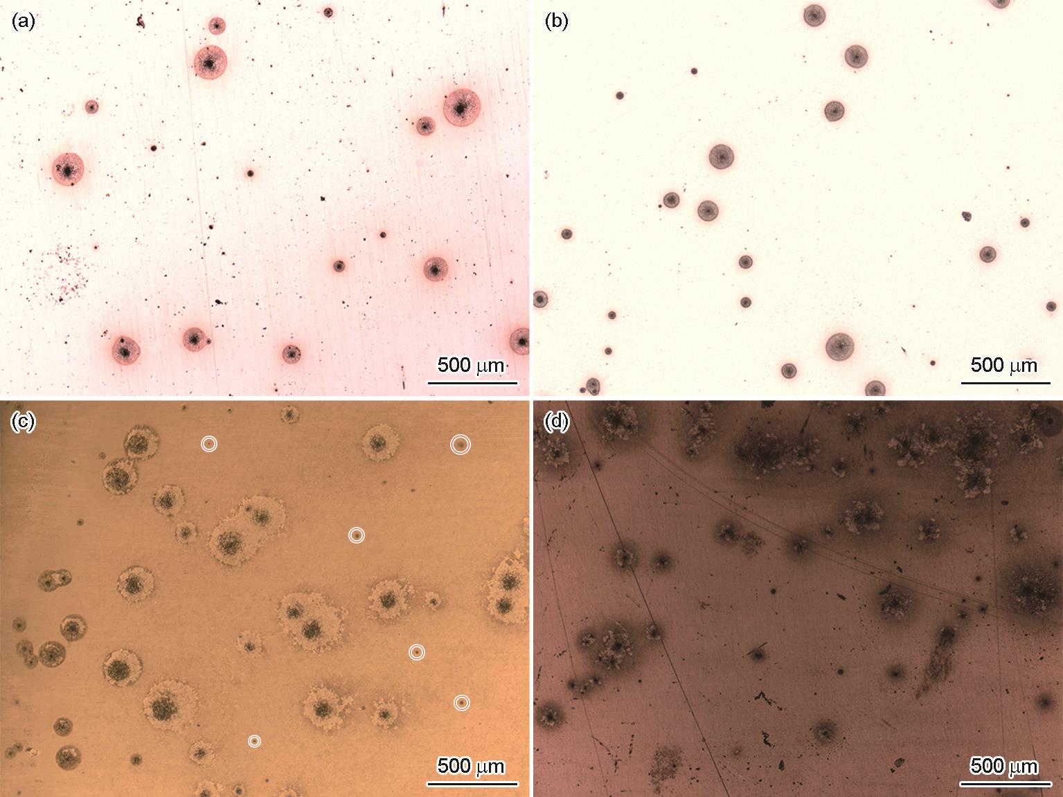 Fig.5 Microscopic images of EH690 steel after immersion for 1 min (a), 5 min (b), 15 min (c) and 20 min (d) |