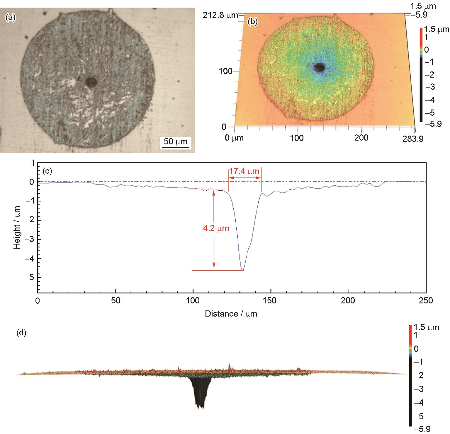 Fig.7 Optical microscopic morphology (a), height map (b), cross-sectional profile (c) and 3D side view (d) of EH690 steel after immersion, showing the occurrence of inclusion induced localized corrosion |