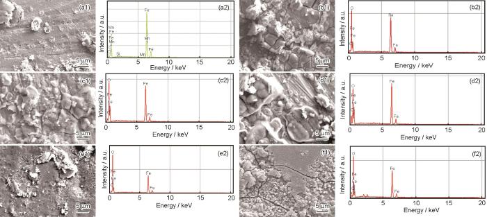 SEM images (a1-f1) and corresponding EDS analysis results (a2-f2) of the corrosion products formed on A106 steel after exposure at 35 ℃ in sc-CO2 environments containing 200 μL/L (a1, a2), 1000 μL/L (b1, b2), 1500 μL/L (c1, c2), 2000 μL/L (d1, d2), 2500 μL/L (e1, e2) and 3000 μL/L (f1, f2) H2O