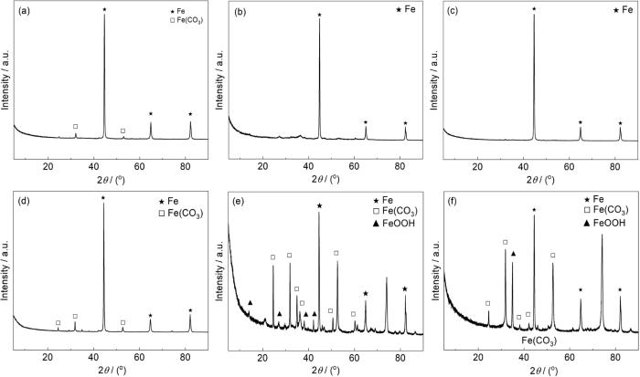 XRD analysis results of the corrosion products formed on A106 steel exposed at 35 ℃ for 5 d in sc-CO2 environments containing 200 μL/L (a), 1000 μL/L (b), 1500 μL/L (c), 2000 μL/L (d), 2500 μL/L (e) and 3000 μL/L (f) H2O