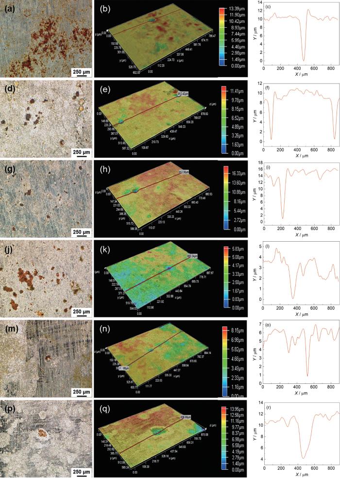 局部腐蚀尤其是点蚀,是超临界CO2环境中典型的腐蚀类型,对管道设施具有极强的破坏性[18~20]。采用3D超景深立体显微镜对不同含水量条件下去除腐蚀产物的腐蚀形貌进行了表征和分析,如图5所示。可以看出试样在不同条件下均发生了明显的点蚀,当含水量为200 μL/L时,试样最大点蚀坑深度约为10 μm,对应的局部腐蚀速率为0.73 mm/a (图5a~c)。当含水量从200 μL/L增加到1500 μL/L时,试样最大点蚀速率并没有发生明显变化,有很多小的点蚀坑可以观察到(图5d~i)。而当含水量为2000和2500 μL/L时,最大点蚀坑深度下降,为4~6 μm (图5l和o),对应局部腐蚀速率为0.29~0.44 mm/a。而当含水量为3000 μL/L时,最大腐蚀坑的直径增加,深度变化较小(图5p~r)。因此,含水率的变化对最大局部腐蚀速率影响较小,反而在较低含水量条件局部腐蚀更为严重,这与其表面形成的不均匀FeCO3腐蚀产物膜密切相关(图3)。不均匀的腐蚀产物膜对金属基底没有保护作用,反而会促进局部腐蚀原电池的形成,加速局部腐蚀。和均匀腐蚀速率(图2)相比,试样的局部腐蚀速率显著增加,而较大的局部腐蚀速率对管道的安全运行产生了极大的威胁。