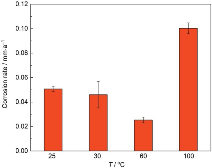 超临界CO2环境中,含水量和温度是影响金属腐蚀的关键因素。在10 MPa和35 ℃且低于水在CO2中的饱和溶解度条件下,随着含水量的增加,试样的腐蚀速率呈逐渐增加的趋势,在含水量为2000 μL/L时,试样腐蚀速率迅速增加,含水量为3000 μL/L时,试样腐蚀速率最大,为0.016 mm/a。试样的腐蚀速率随着温度的增加先减小后增大,极小值在60 ℃出现,为0.025 mm/a,100 ℃时试样的腐蚀速率最大,为0.1 mm/a。