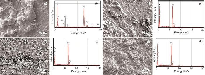 Surface morphologies and EDS results of A106 steel after exposure for 5 d in sc-CO2 environment containing 2000 μL/L H2O at 25 ℃ (a, b), 35 ℃ (c, d), 60 ℃ (e, f) and 100 ℃ (g, h)