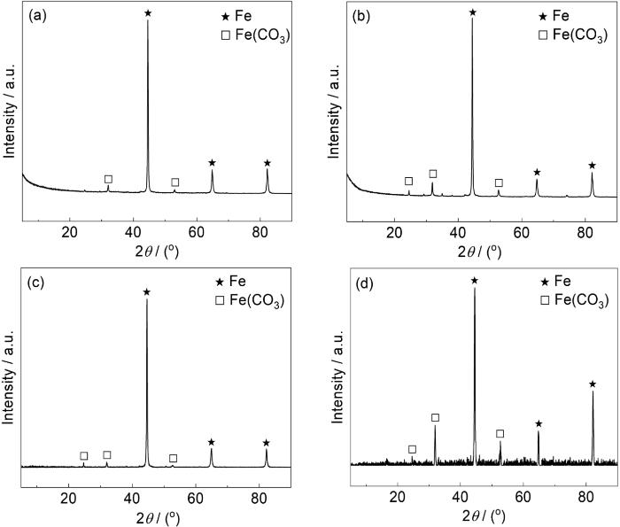 XRD patterns of A106 steel exposed for 5 d in sc-CO2 environment containing 2000 μL/L H2O at 25 ℃ (a), 35 ℃ (b), 60 ℃ (c), 100 ℃ (d)