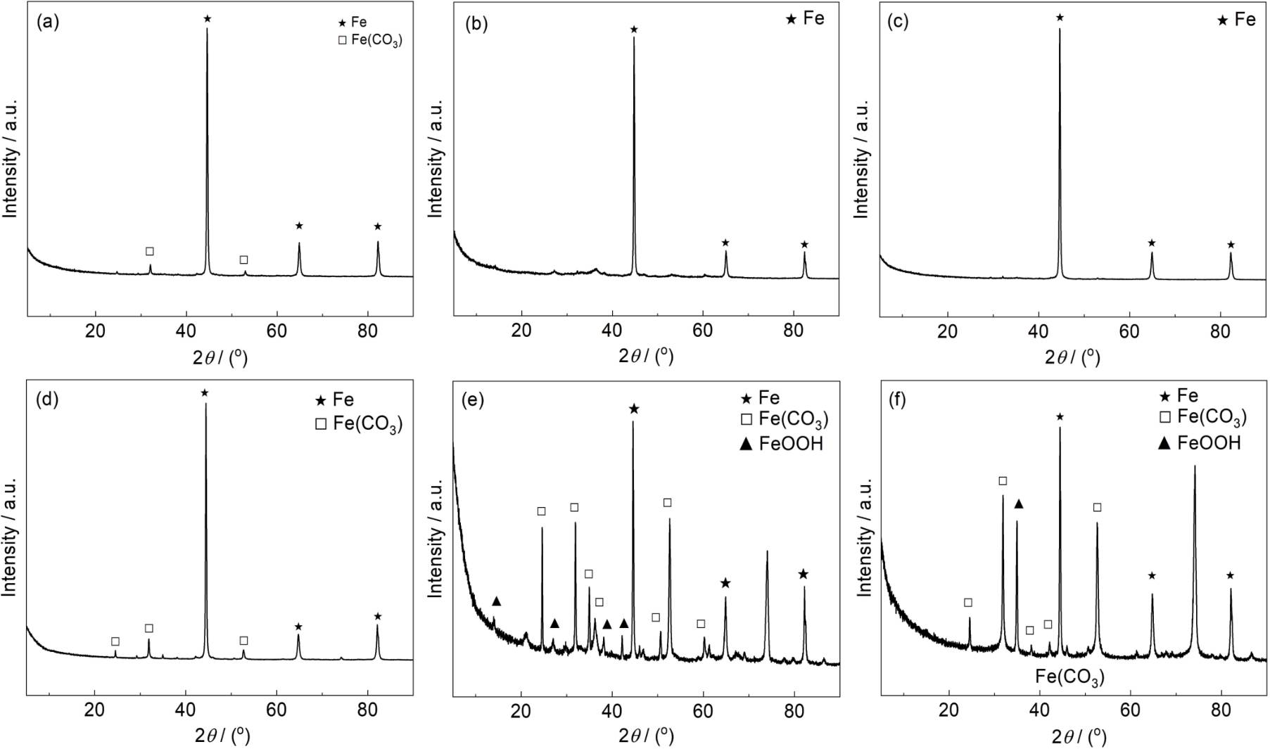 Fig.4 XRD analysis results of the corrosion products formed on A106 steel exposed at 35 ℃ for 5 d in sc-CO2 environments containing 200 μL/L (a), 1000 μL/L (b), 1500 μL/L (c), 2000 μL/L (d), 2500 μL/L (e) and 3000 μL/L (f) H2O |