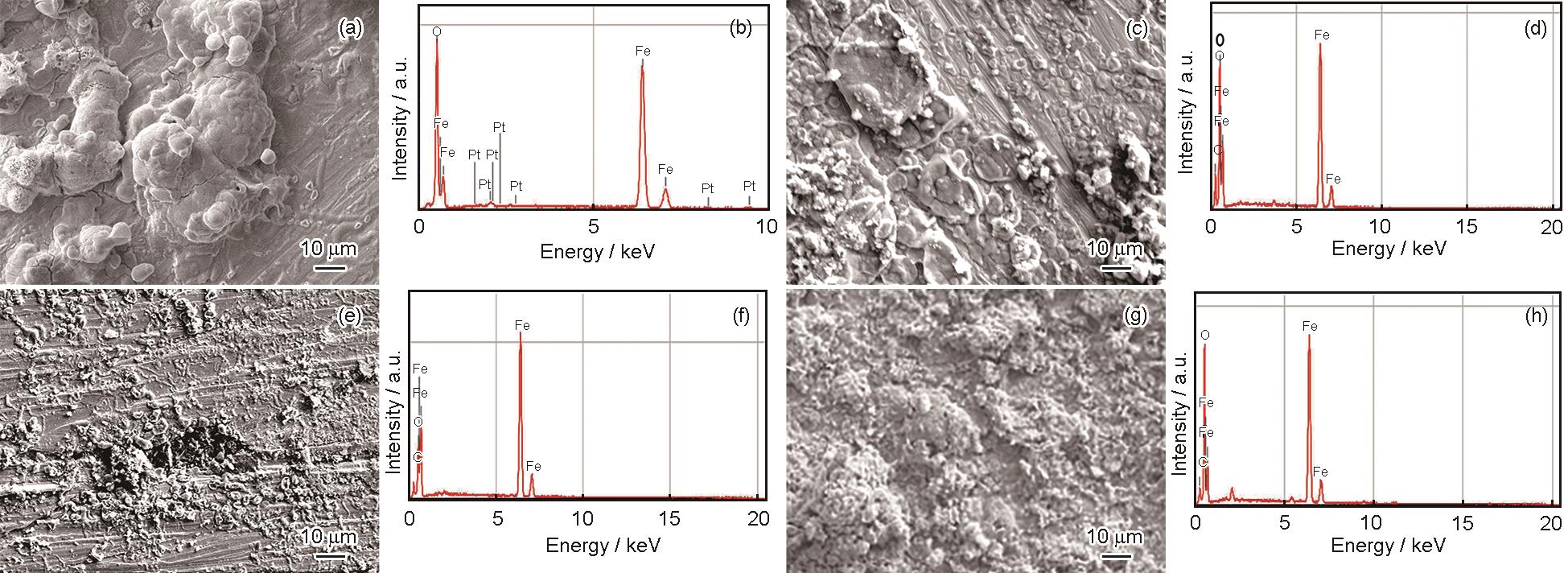 Fig.7 Surface morphologies and EDS results of A106 steel after exposure for 5 d in sc-CO2 environment containing 2000 μL/L H2O at 25 ℃ (a, b), 35 ℃ (c, d), 60 ℃ (e, f) and 100 ℃ (g, h) |