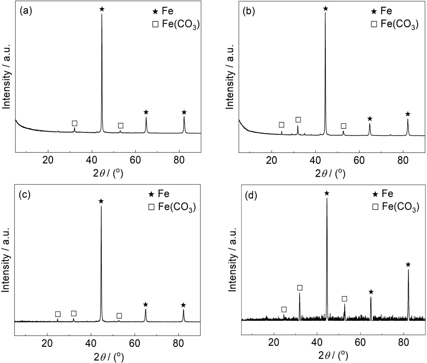 Fig.8 XRD patterns of A106 steel exposed for 5 d in sc-CO2 environment containing 2000 μL/L H2O at 25 ℃ (a), 35 ℃ (b), 60 ℃ (c), 100 ℃ (d) |