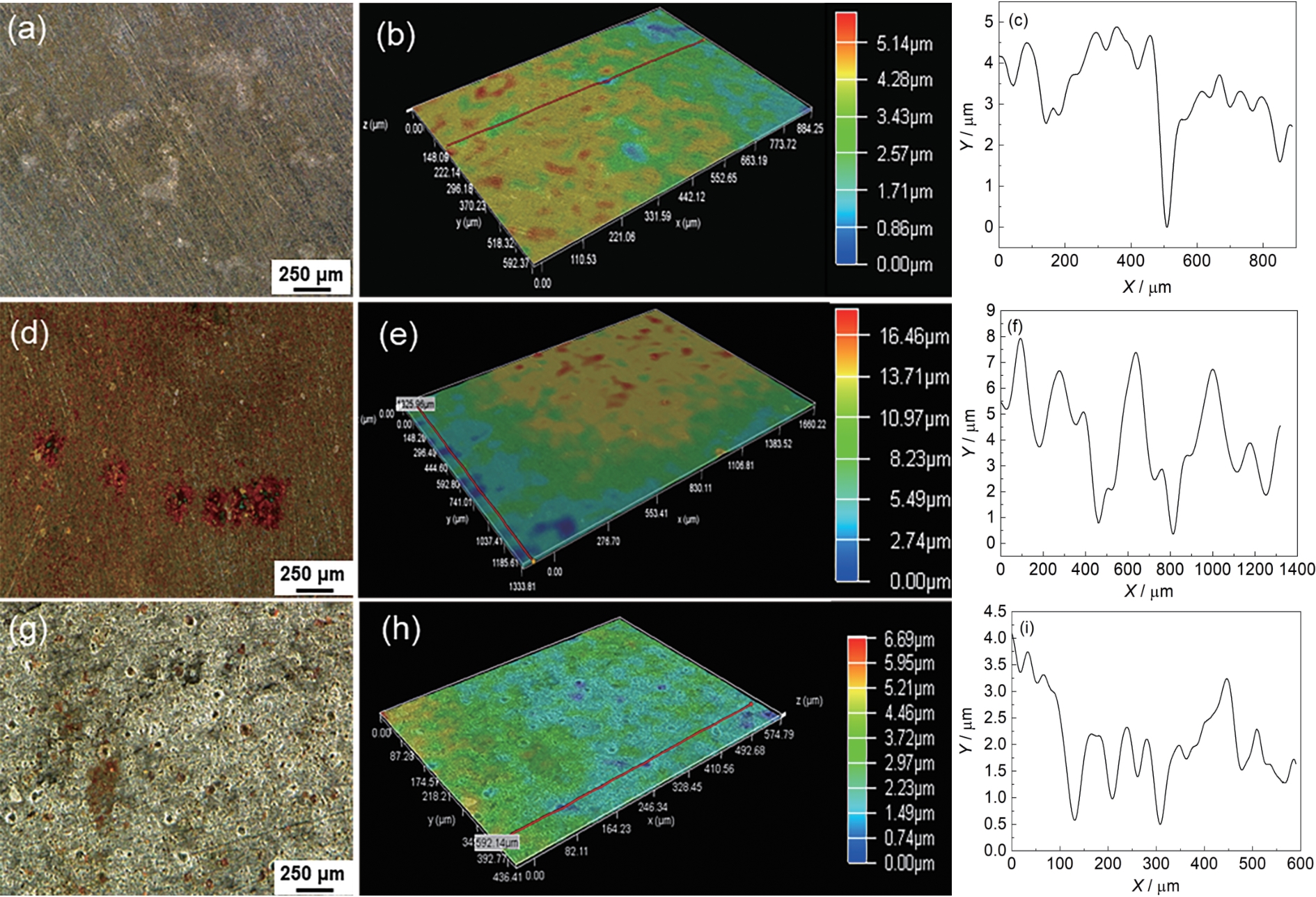 Fig.9 Two-dimension (a, d, g) and three-dimension (b, e, h) surface morphologies of the specimens and the corresponding curves of corrosion pits (c, f, i) after removing the corrosion products formed during exposure for 5 d in sc-CO2 environment containing 2000 μL/L H2O at 25 ℃ (a-c), 60 ℃ (d-f) and 100 ℃ (g-i) |