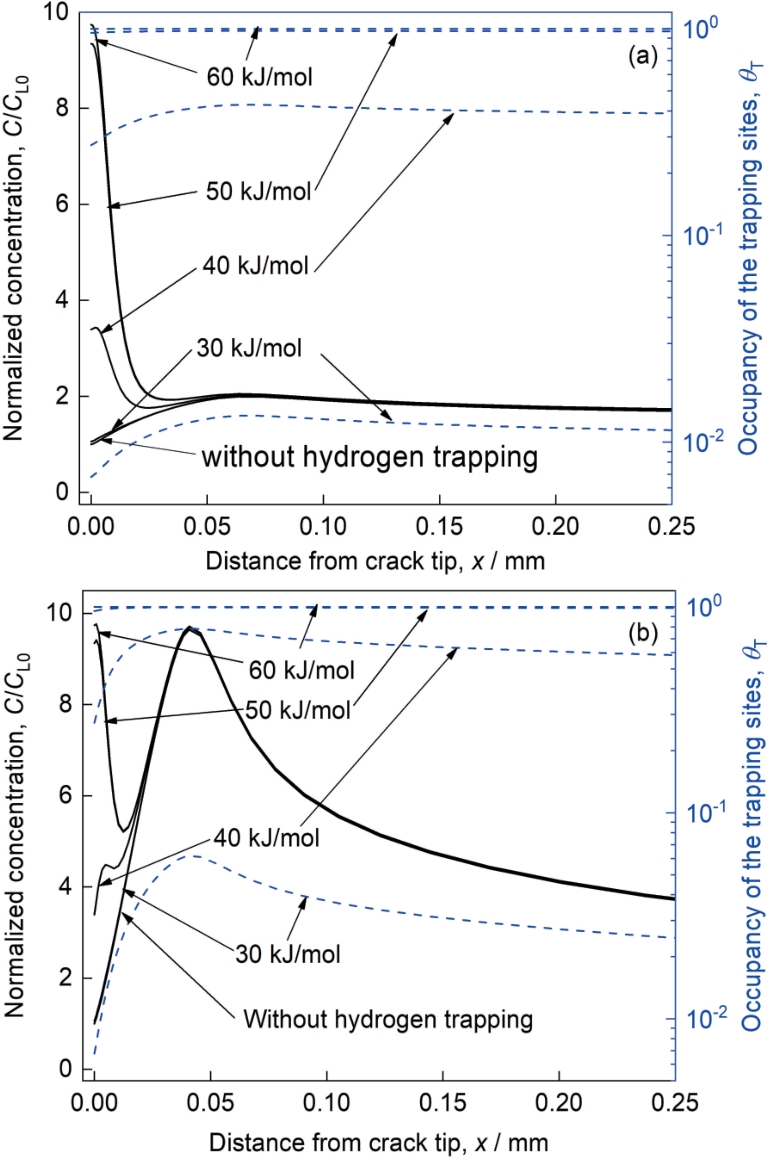 Fig.6 Total hydrogen concentration and the occupancy of the trapping sites near crack tip (a) low strength steel, (b) high strength steel |