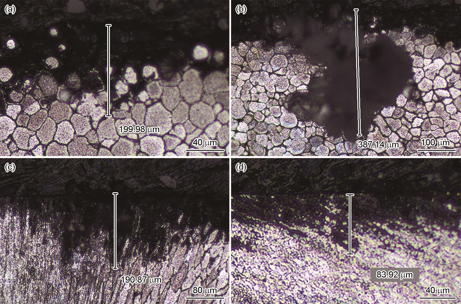 | Fig.5 Measurements of intergranular corrosion depths for different zones of the welded joint after corrosion for 6 h: (a) BM, (b) HAZ, (c) TMAZ, (d) NZ |