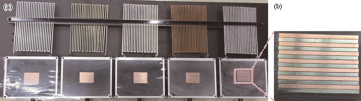 | Fig.2 Appearance photos of carbon steel, galvanized steel (ZF), Zn, Cu, and Al sensors (a) and partial enlarged view of the galvanic sensor (b) |