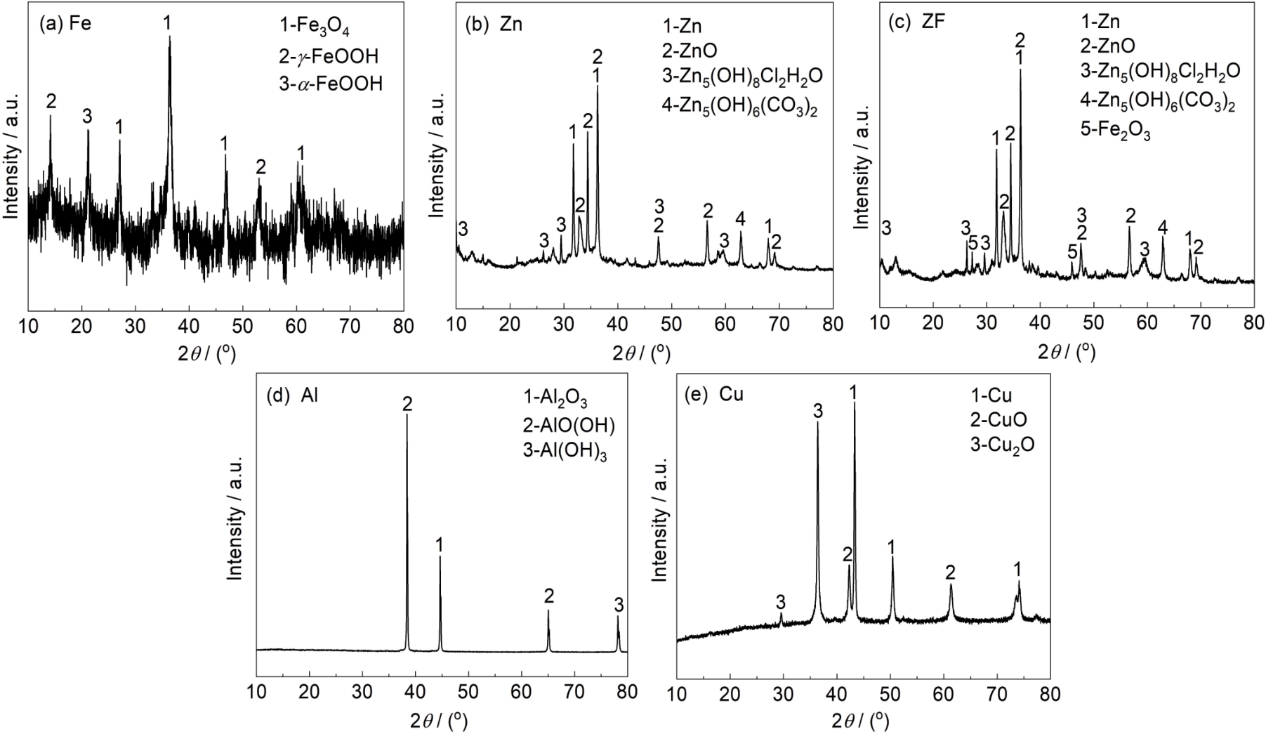 | Fig.7 XRD patterns of carbon steel (a), Zn (b), ZF (c), Al (d) and Cu (e) after 1 a atmospheric exposure |