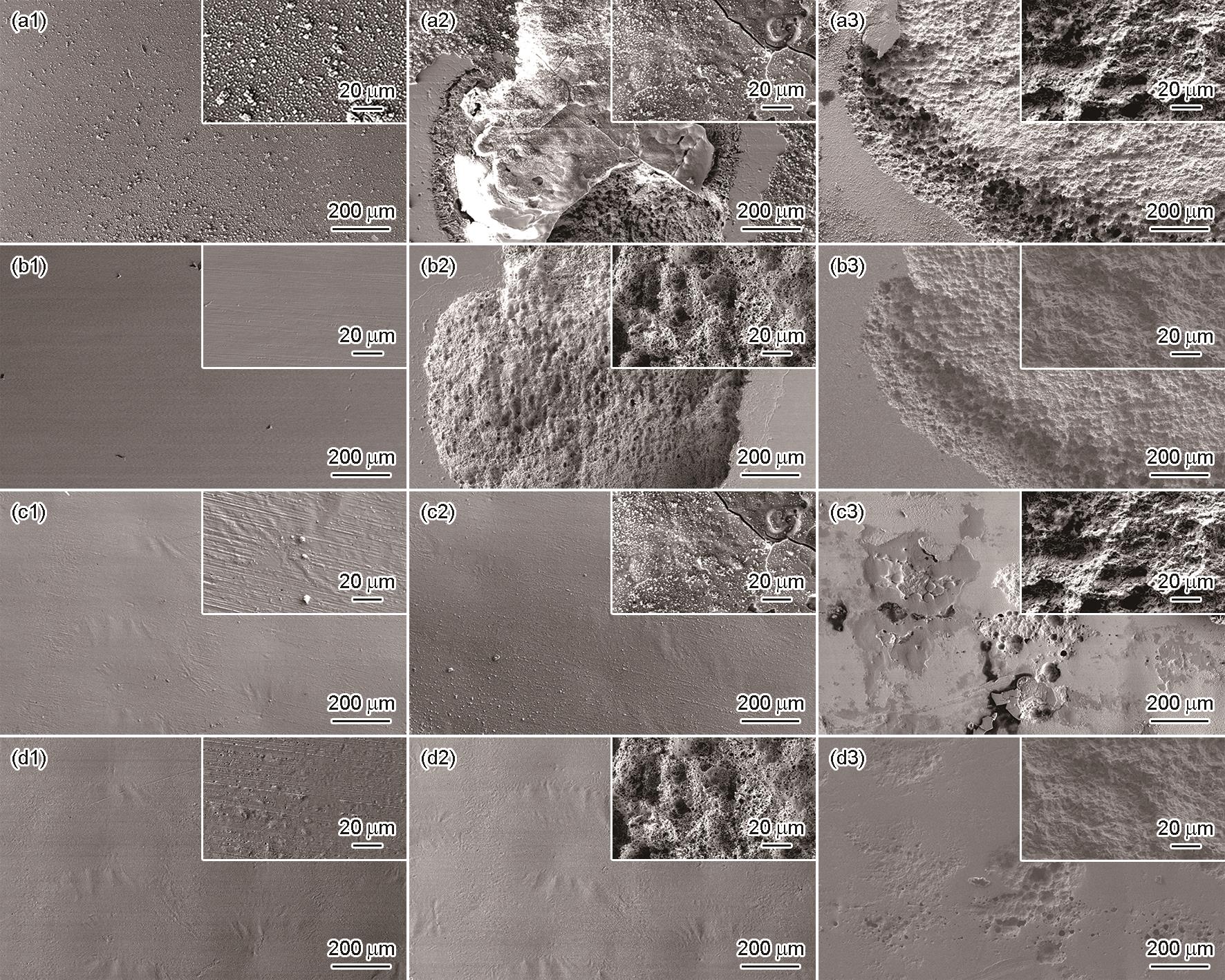 Fig.6 Corrosion morphologies of Zn-0.4Mn alloy (a, b) and LSR-treated Zn-0.4Mn alloy (c, d) with (a, c) and without (b, d) corrosion products after immersed in SBF for 3 d (a1-d1), 7 d (a2-d2) and 15 d (a3-d3) |