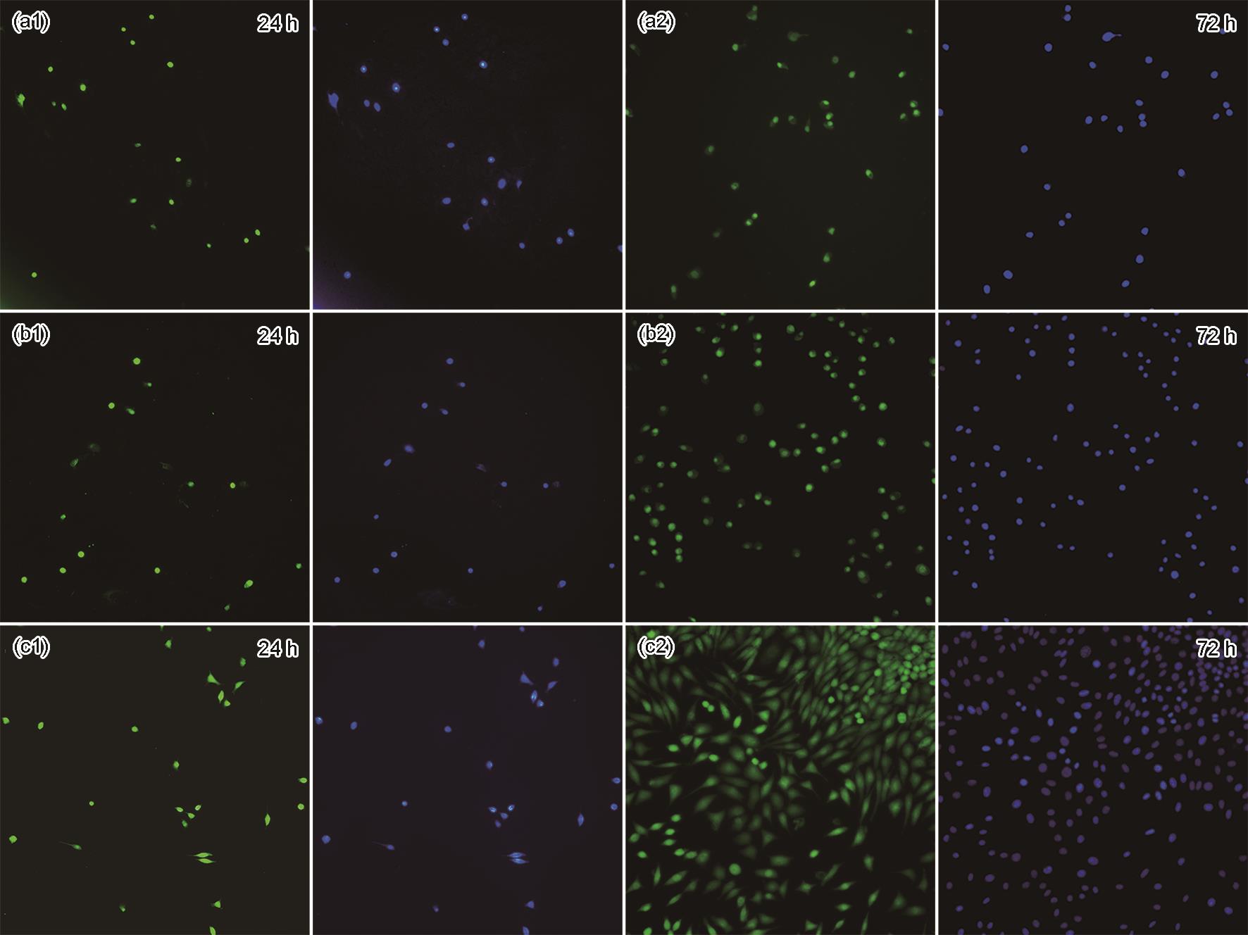 Fig.8 Growth morphologies of L-929 cells cultured for various times in Zn-0.4Mn alloy (a), LSR-treated Zn-0.4Mn alloy (b) and comparison group (c) with 25% concentration of extracts |