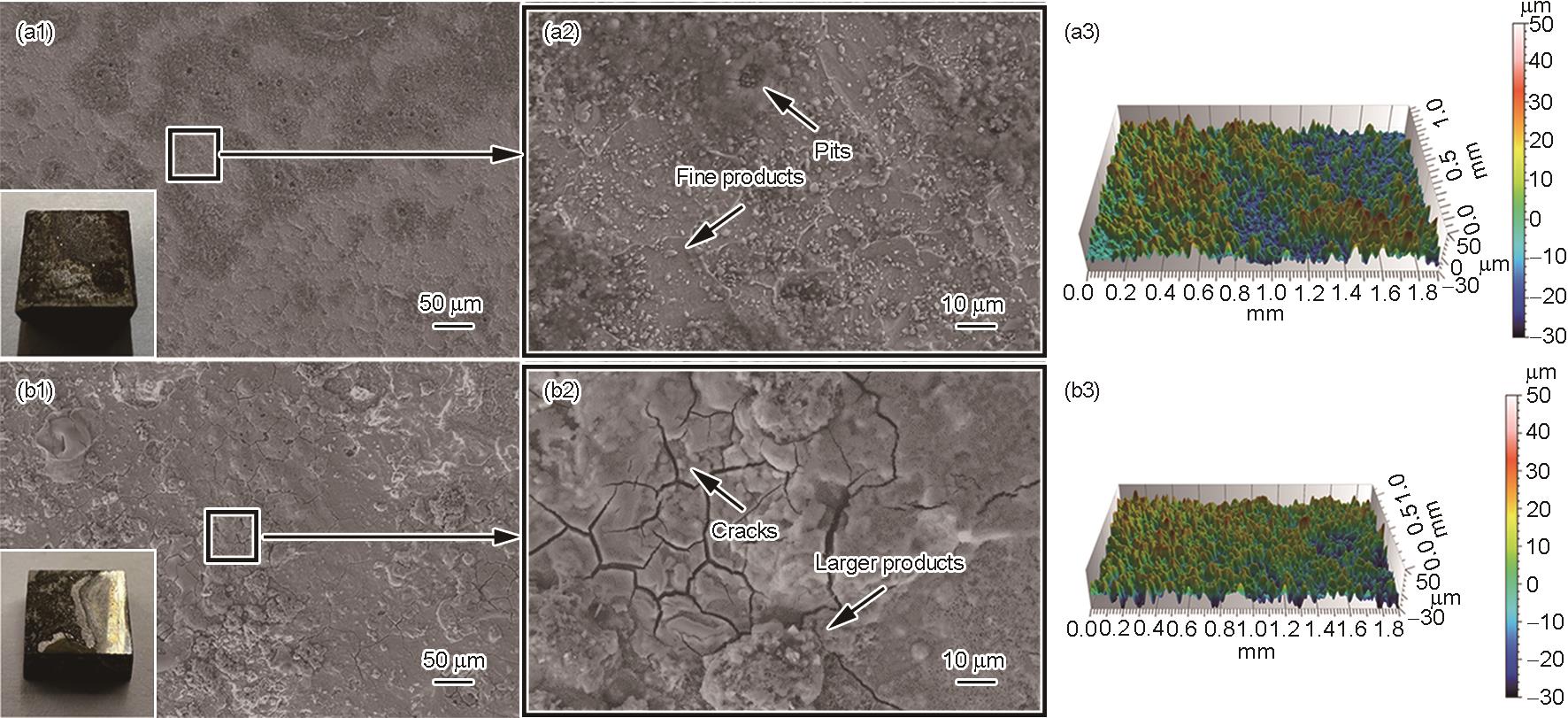 图6 921A和921A/Ti80样品在3.5%NaCl溶液中全浸泡16 d后的表面形貌和三维形貌 |