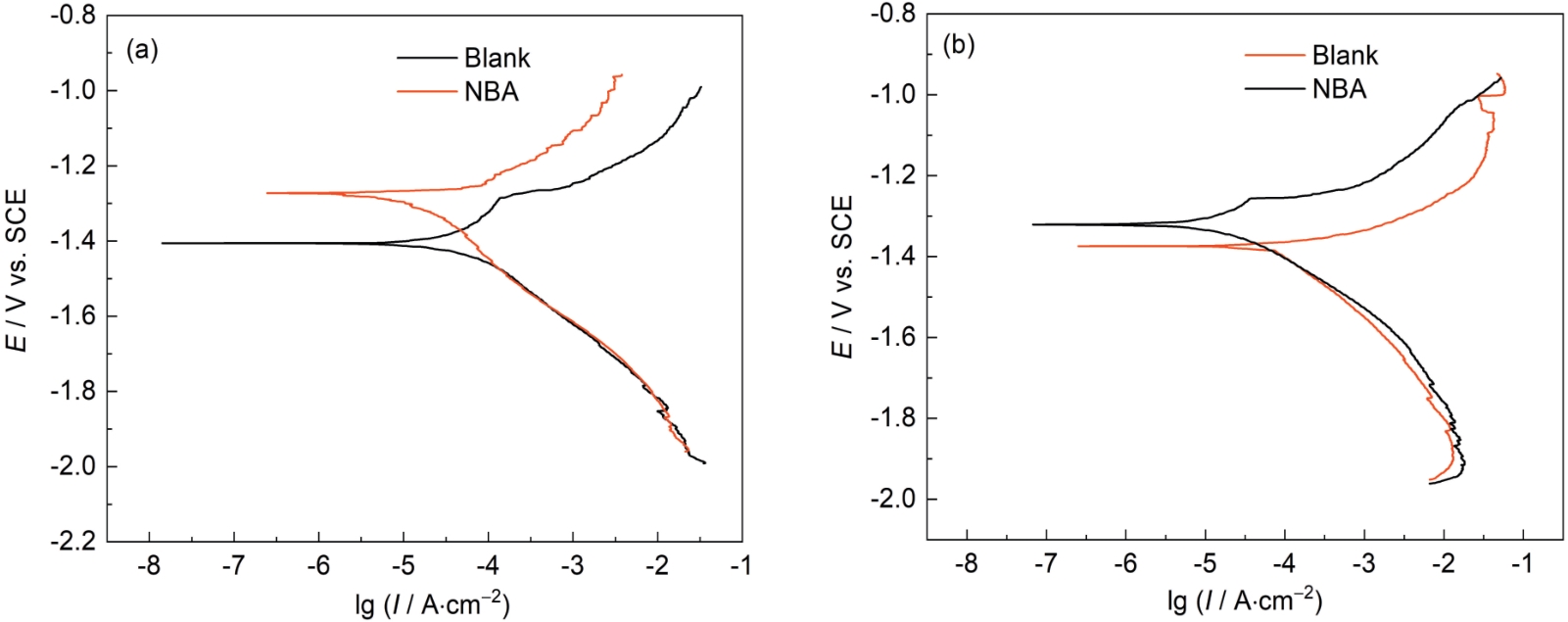 图1 AZ31B与AZ91D镁合金在含/不含1 g/L NBA的盐水溶液中浸泡24 h后的动电位极化曲线 |