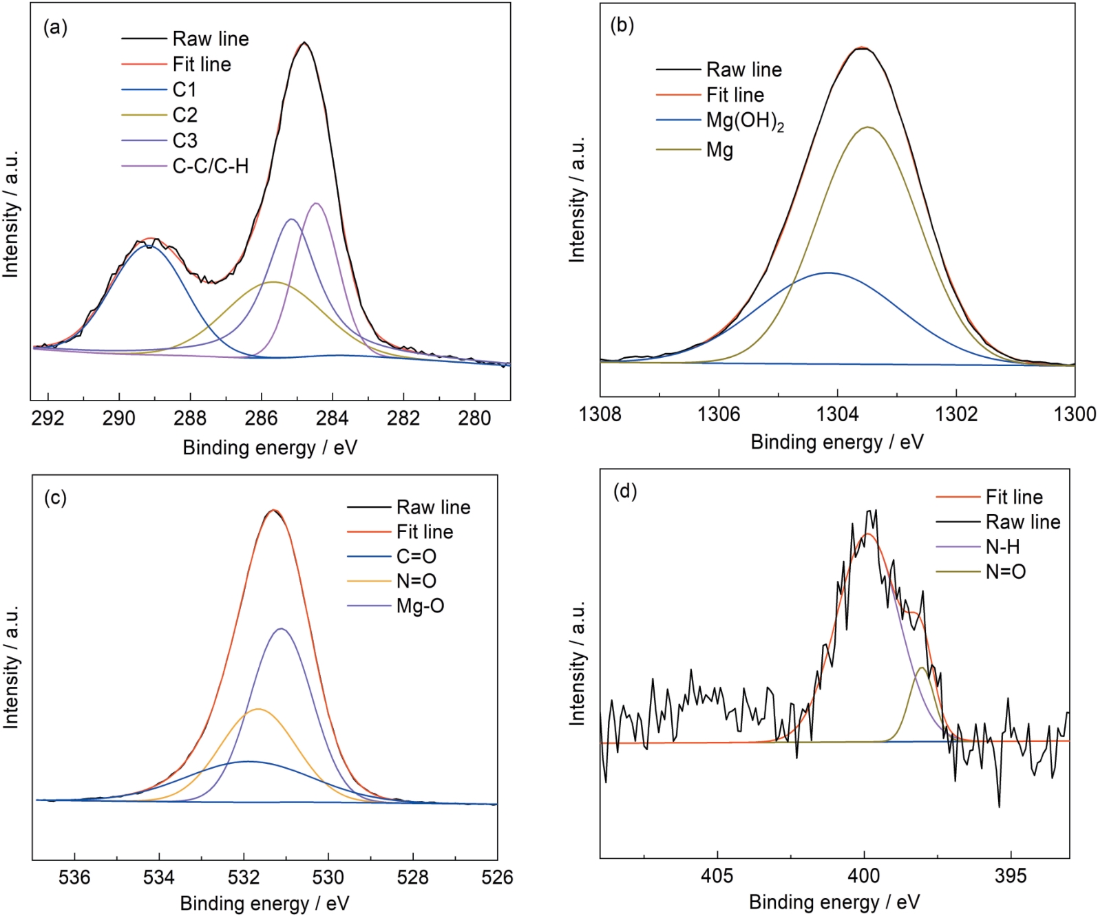 Fig.11 High resolution spectra of AZ31B Mg-alloy soaked in 3.5%NaCl solution with 1 g/L NBA at 50 ℃ for 72 h: (a) C 1s, (b) Mg 1s, (c) O 1s, (d) N 1s |