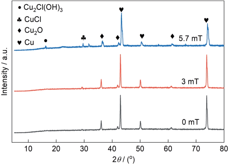 Fig.7 XRD patterns of copper foil exposed for 7 d under TEL condition at different self-generated magnetic field levels |