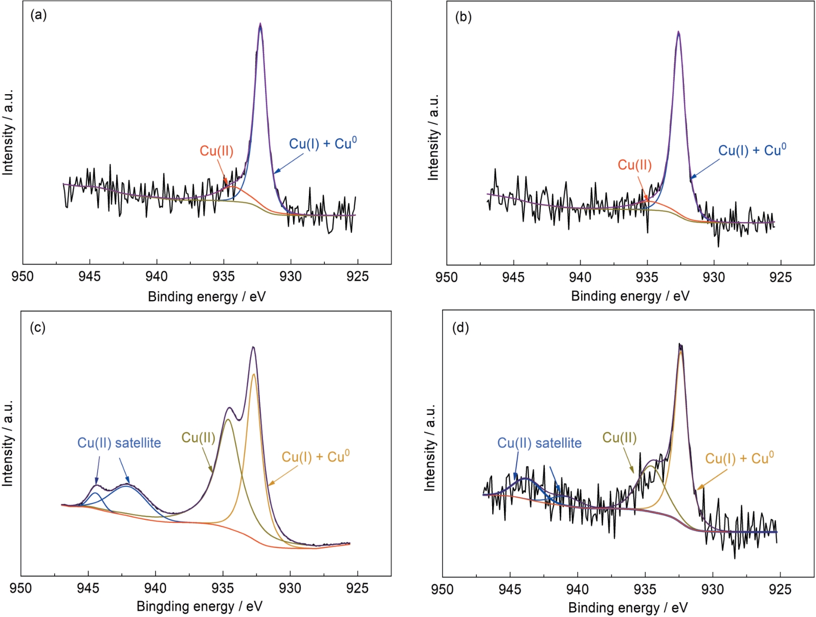 Fig.8 XPS fine spectra of Cu 2p3/2 of the corrosion films formed on copper foil exposed for 7 d at different self-generated magnetic field levels: (a) 0 mT input end, (b) 0 mT output end, (c) 5.7 mT input end, (d) 5.7 mT output end |