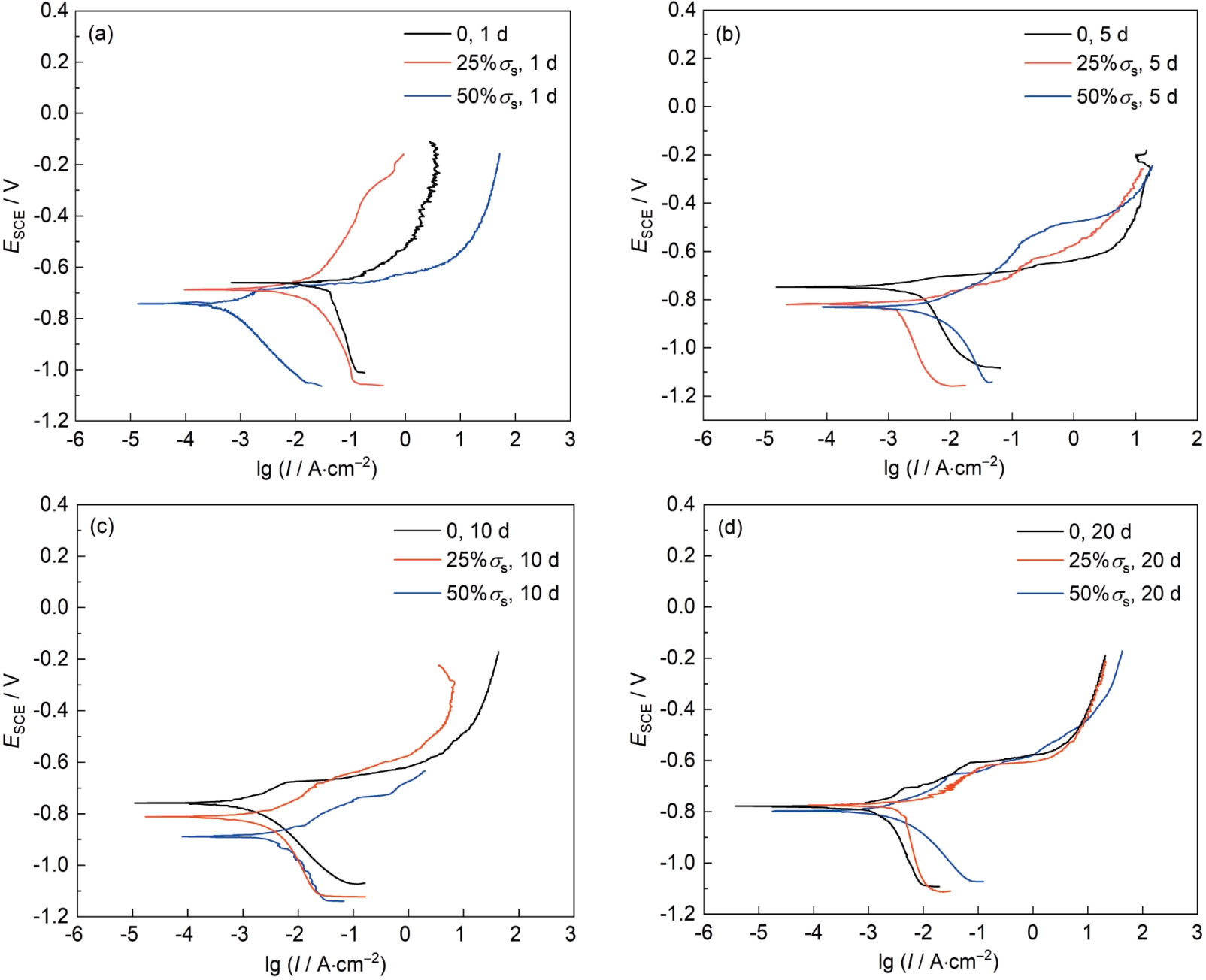 Fig.4 Polarization curves of the welded joint immersed in low-temperature seawater under different stresses for 1 d (a), 5 d (b), 10 d (c) and 20 d (d) |
