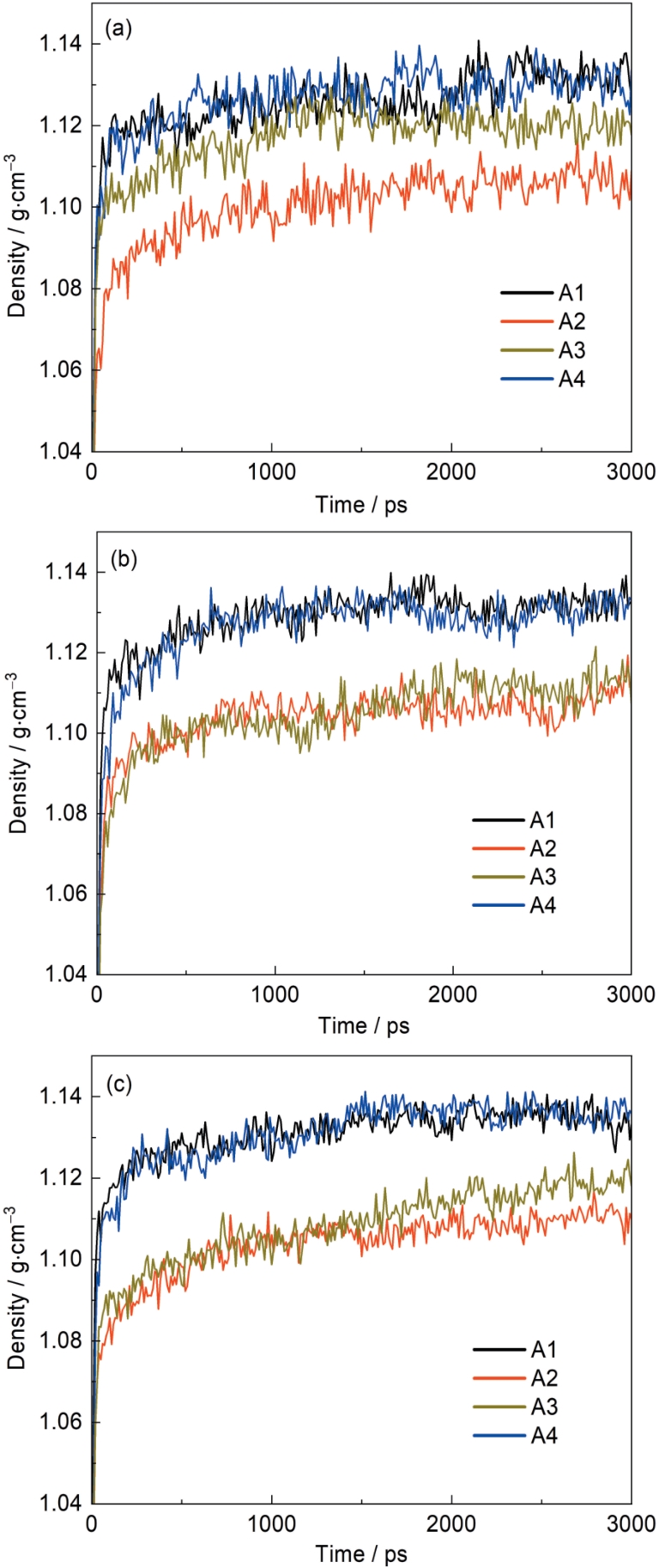 | 图3 聚脲体系在不同聚合程度下的密度随模拟时间的演变 |