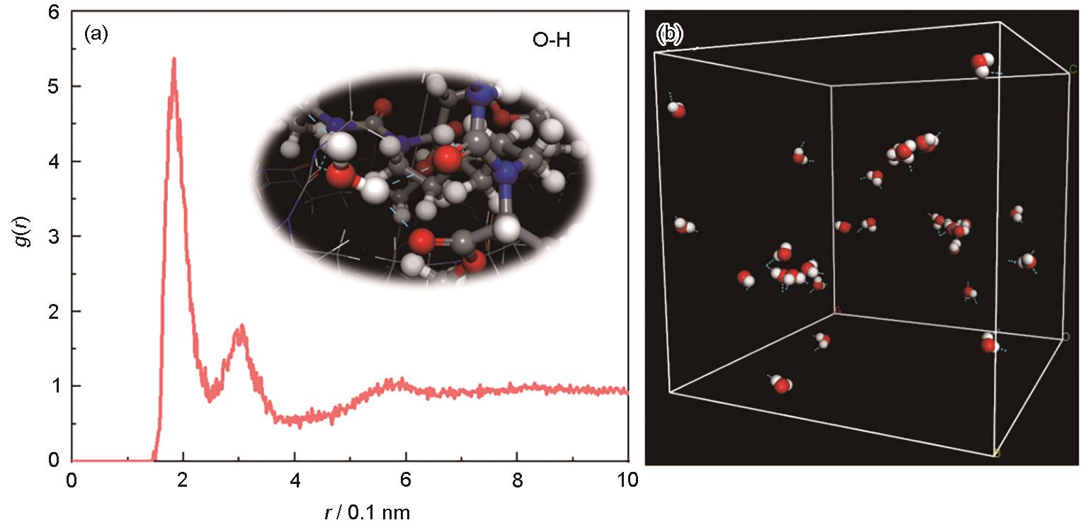 | Fig.7 Radial distribution function between the double bond oxygen atom in A4 polyurea molecular structure and the hydrogen atom in water molecule (a), and distribution of water molecules and their hydrogen bonding structures with polyurea molecules (b) |