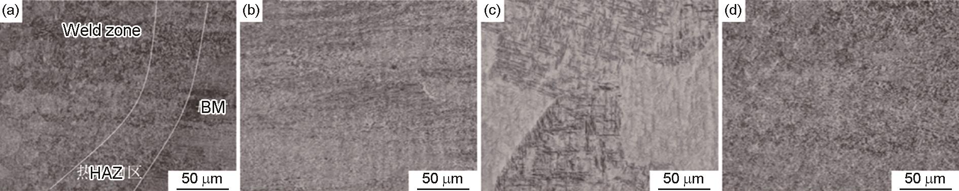 Fig.2 Microstructures of TC4 Ti-alloy MIG welded joint: (a) welded joint, (b) base material, (c) weld zone, (d) heat affected zone[ |