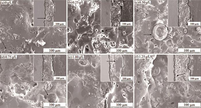 Surface and cross-sectional morphologies of MAO films formed on Ti-alloy in the electrolytes containing different contents of ZrO2 particles: (a) 0 g/L, (b) 0.25 g/L, (c) 0.5 g/L, (d) 0.75 g/L, (e) 1.00 g/L, (f) 1.25 g/L[36]