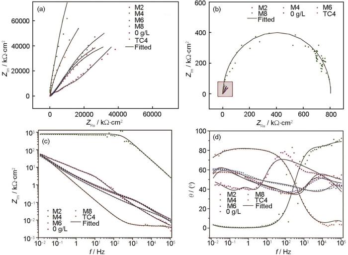 ... [46]EIS and fitting curves of MAO coating formed in the electrolyte containing MoS2 particles in 3.5% (mass fraction) NaCl solution: (a, b) Nyquist plots, (c) Bode impedance plots, (d) Bode phase angle plots[46]Fig.2