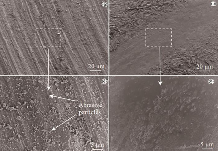 Abrasion SEM morphology of the surface film layer of GO particles with different contents added to the electrolyte: (a, c) 0 g/L, (b, d) 5 g/L[64]