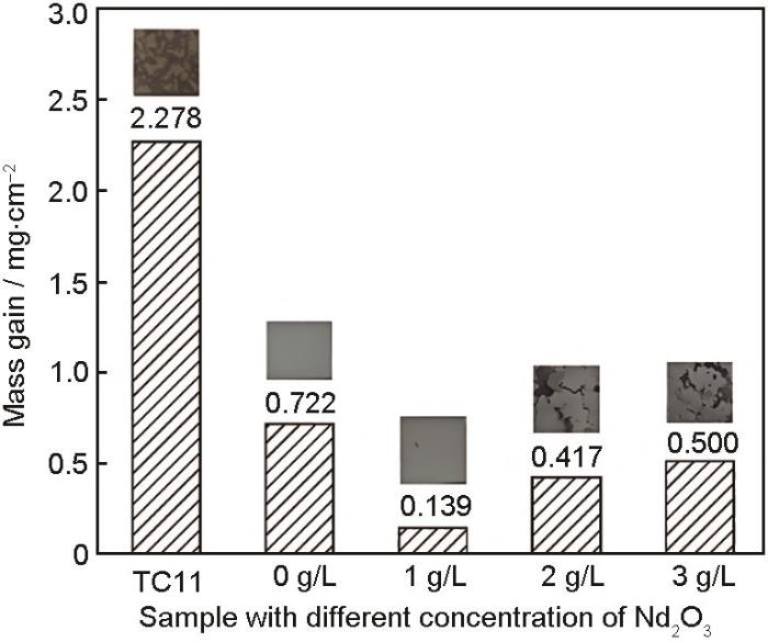 ... [55]Mass gains and corresponding macroscopic morphologies of TC11 alloy without and with MAO treatments in the electrolytes containing different concentrations of Nd2O3 after oxidation at 800 ℃ for 50 h[55]Fig.4