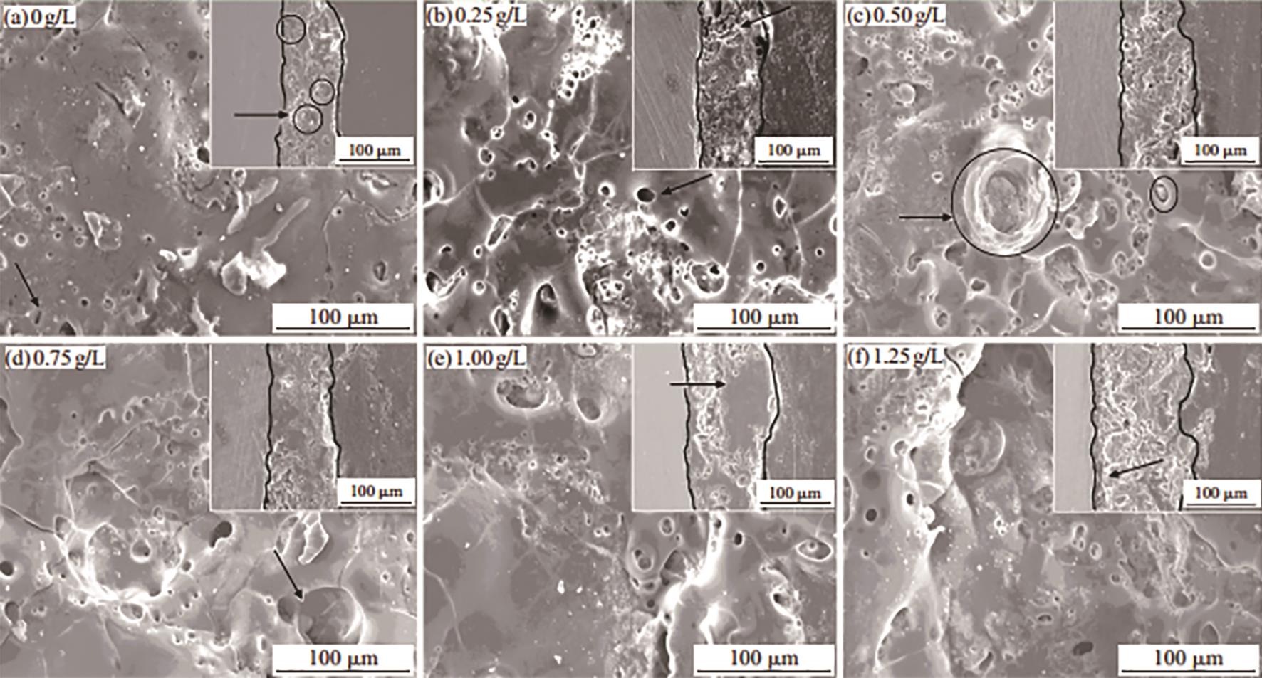 Fig.1 Surface and cross-sectional morphologies of MAO films formed on Ti-alloy in the electrolytes containing different contents of ZrO2 particles: (a) 0 g/L, (b) 0.25 g/L, (c) 0.5 g/L, (d) 0.75 g/L, (e) 1.00 g/L, (f) 1.25 g/L[ |