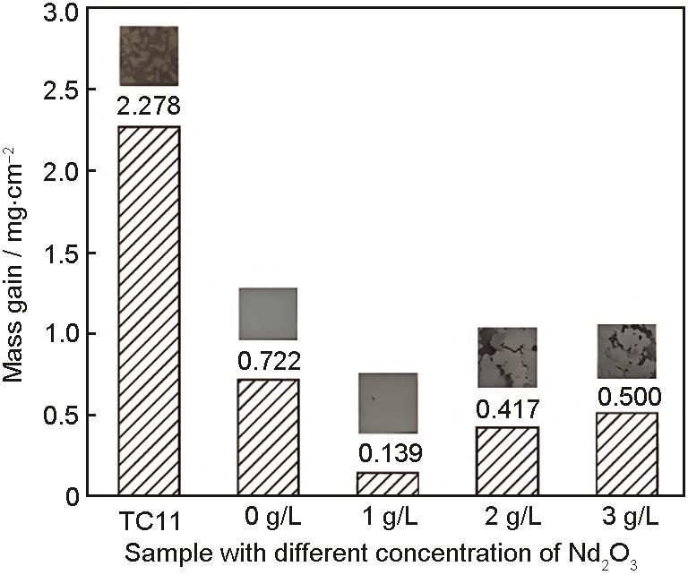 Fig.4 Mass gains and corresponding macroscopic morphologies of TC11 alloy without and with MAO treatments in the electrolytes containing different concentrations of Nd2O3 after oxidation at 800 ℃ for 50 h[ |