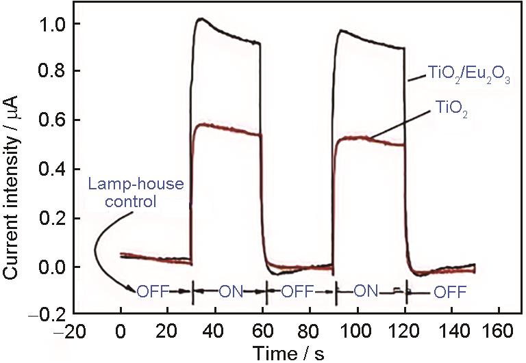 | Fig.6 Photogenerated current intensities of TiO2 and TiO2/Eu2O3 MAO films[ |