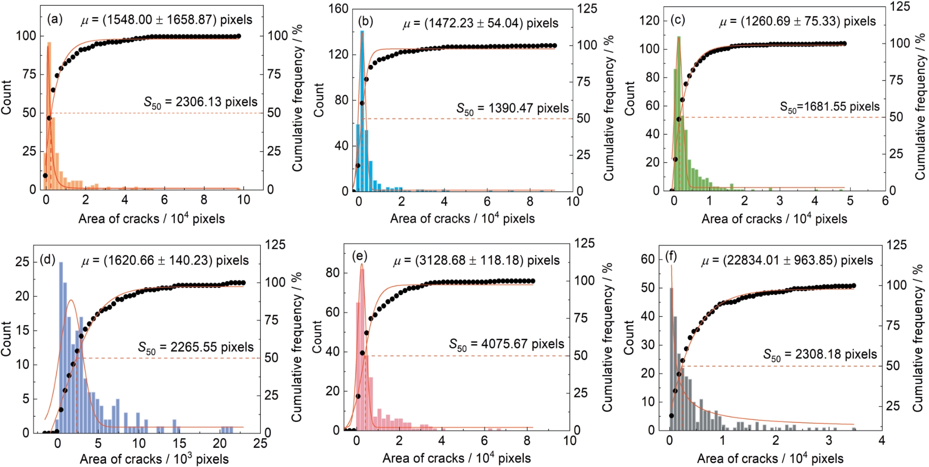 | Fig.5 Histograms of area-frequency distributions of resin shedding pits in the coating after immersion-wear cyclic test for different cycles: (a) 1 cyc, (b) 5 cyc, (c) 9 cyc, (d) 13 cyc, (e) 17 cyc, (f) 20 cyc |