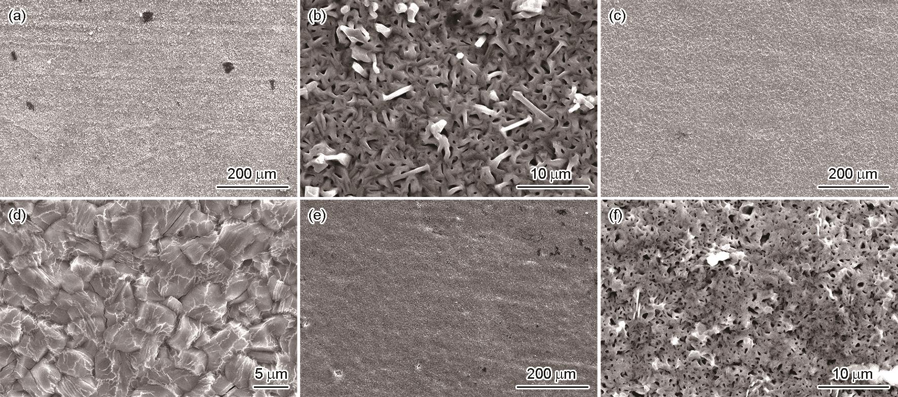 Fig.4 SEM surface morphologies of nitrided F91 steel oxidized in SCW at 600 ℃ for 100 h (a, b), 1000 h (c, d) and 3000 h (e, f) |