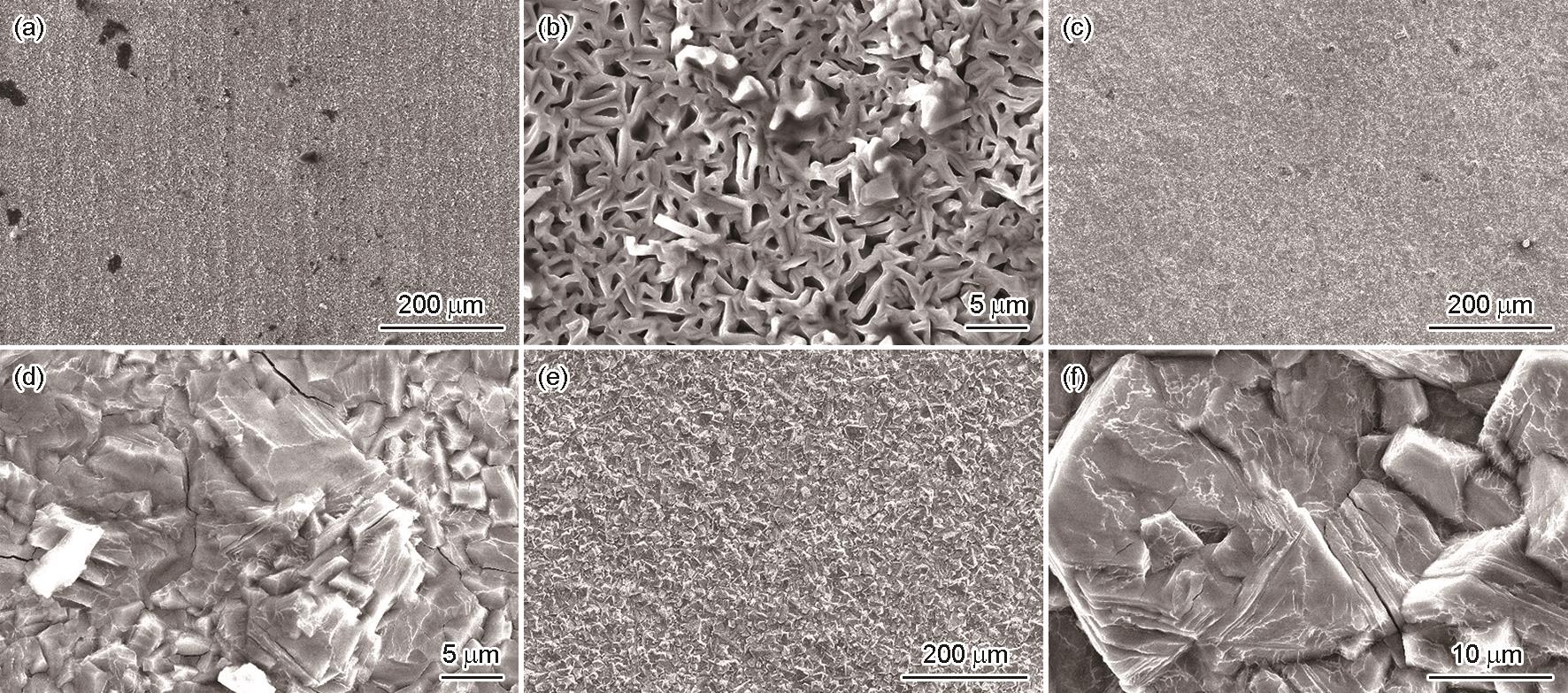Fig.5 SEM surface morphologies of nitrided F91 steel oxidized in SCW at 620 ℃ for 100 h (a, b), 1000 h (c, d) and 3000 h (e, f) |