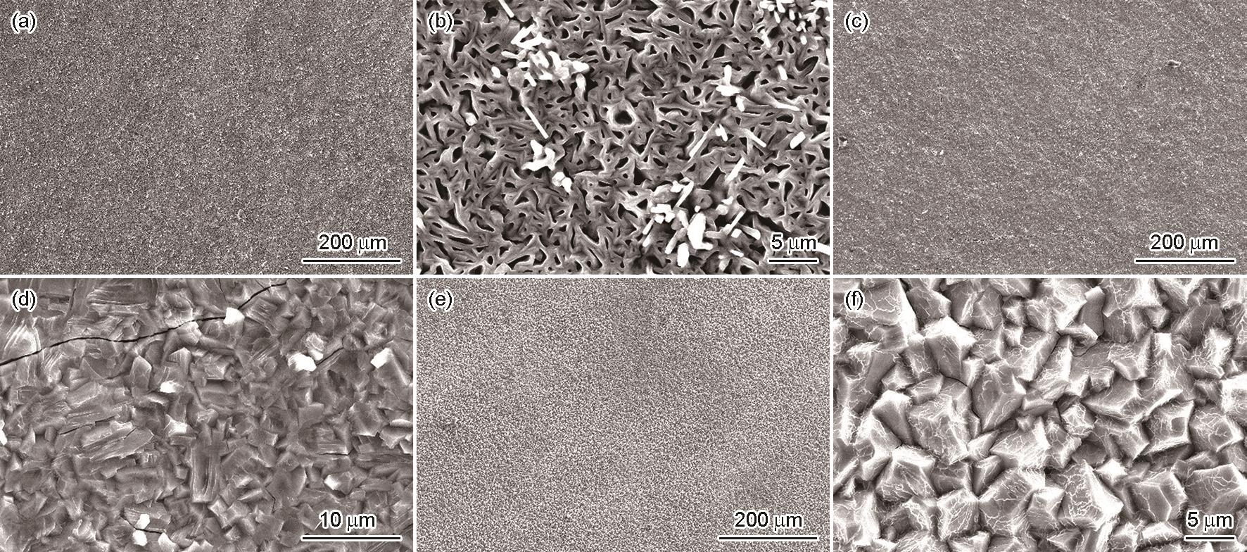 Fig.7 SEM surface morphologies of F92 steel oxidized in SCW at 620 ℃ for 100 h (a, b), 1000 h (c, d) and 3000 h (e, f) |