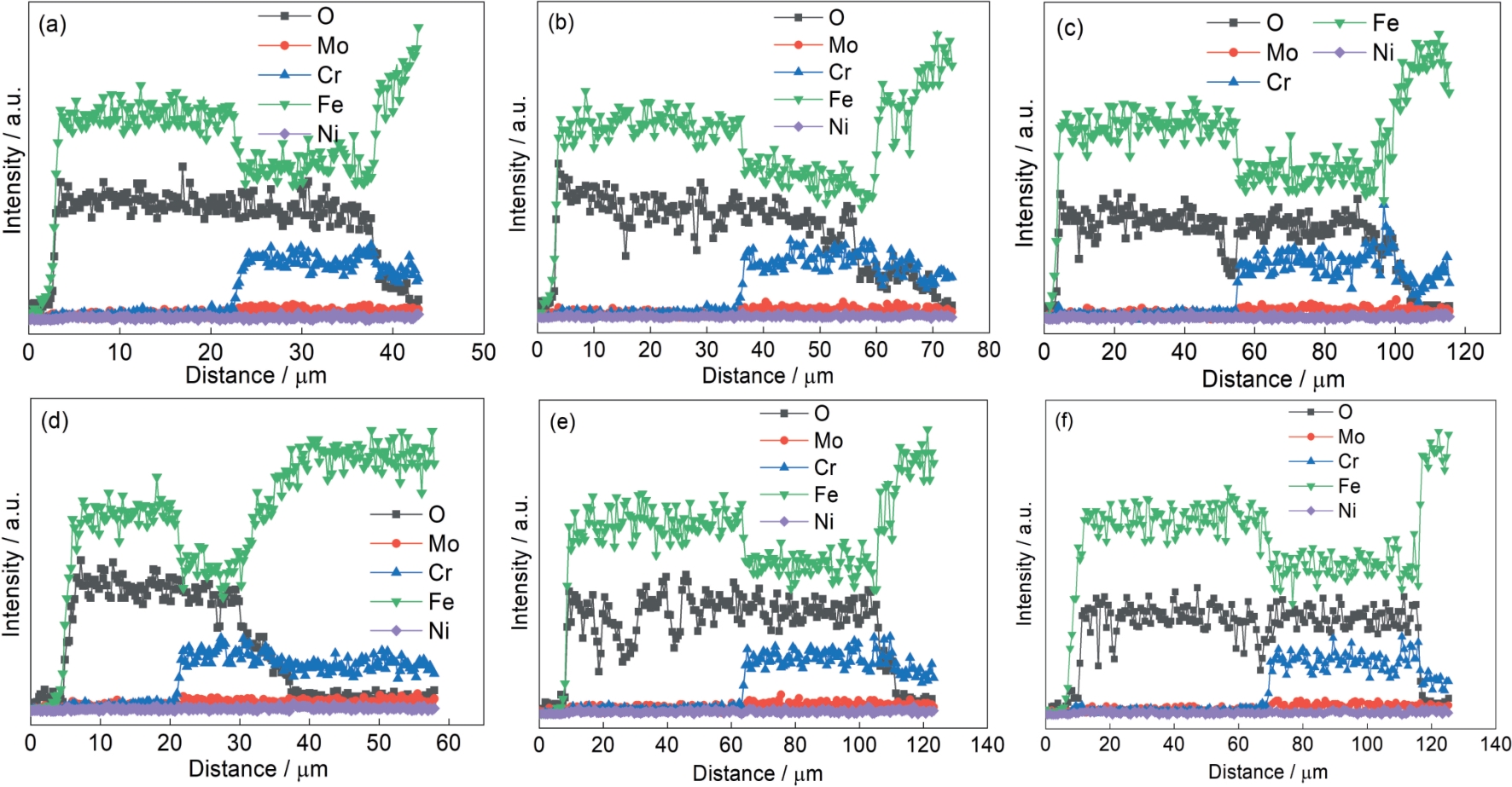 Fig.10 Depth profiles of various elements in the oxide scales formed on F91 steel after oxidation in SCW at 600 ℃-100 h (a), 600 ℃-1000 h (b), 600 ℃-3000 h (c), 620 ℃-100 h (d), 620 ℃-1000 h (e) and 620 ℃-3000 h (f) |
