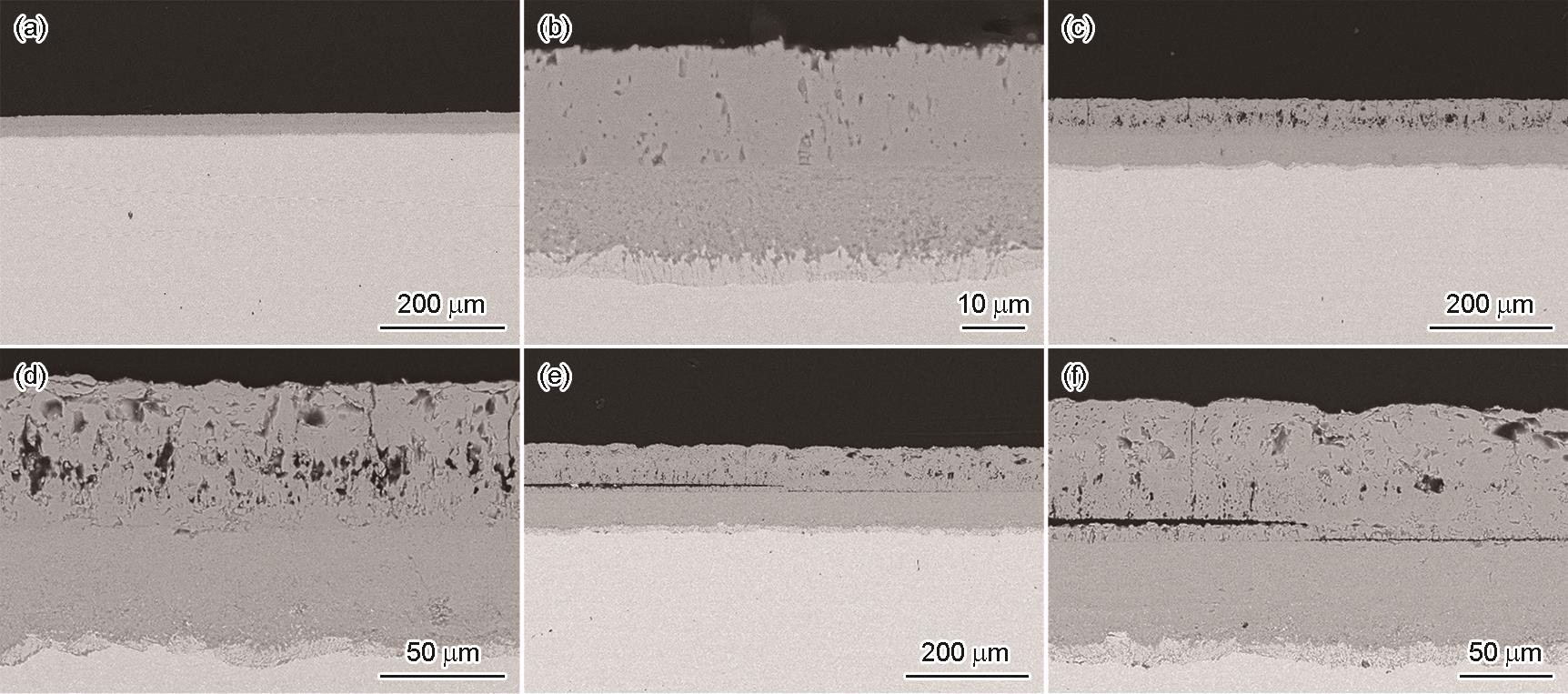 Fig.15 Cross-sectional SEM images of F92 steel oxidized in SCW at 620 ℃ for 100 h (a, b), 1000 h (c, d) and 3000 h (e, f) |