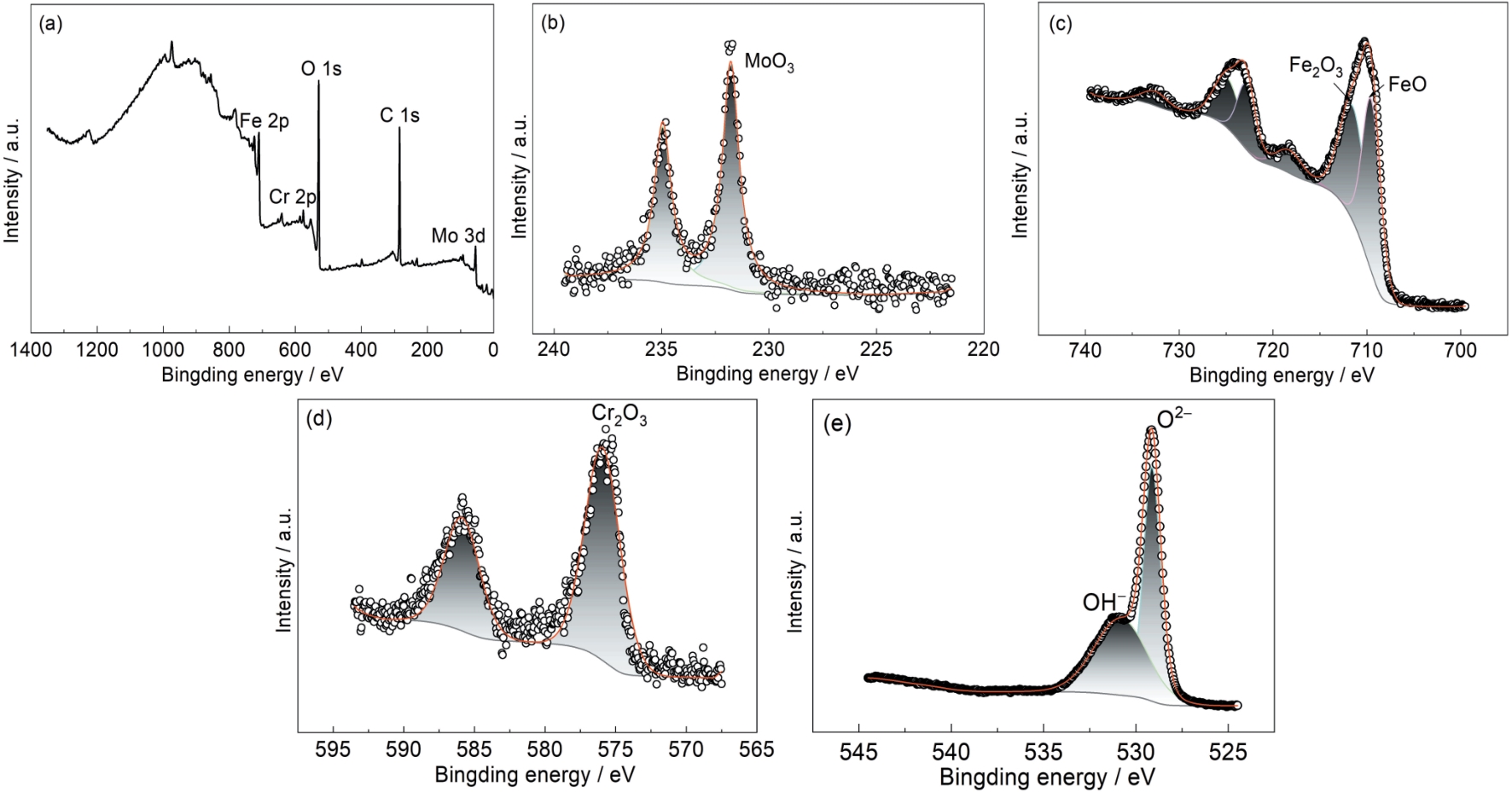 Fig.22 XPS full spectrum of the oxide scale of F92 steel oxidized in SCW for 3000 h at 600 ℃ (a), and fine peaks of Mo 3d (b), Fe 2p (c), Cr 2p (d), and O 1s (e) |