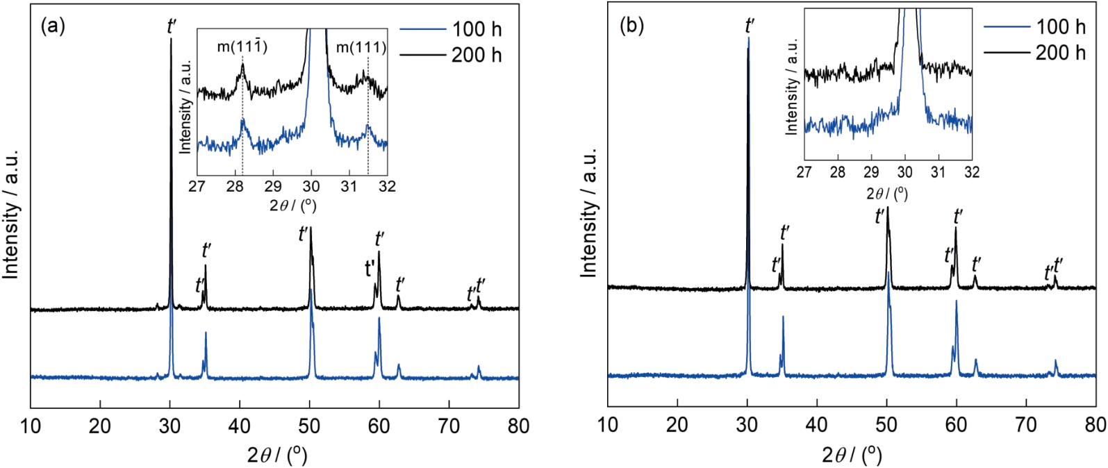 Fig.5 XRD patterns of TBCs with the YSZ top coatings deposited by Metco 9M (a) and Praxair 7700 (b) after corrosion for 100 and 200 h in the composite environment of water vapor and NaCl at 900 ℃ |