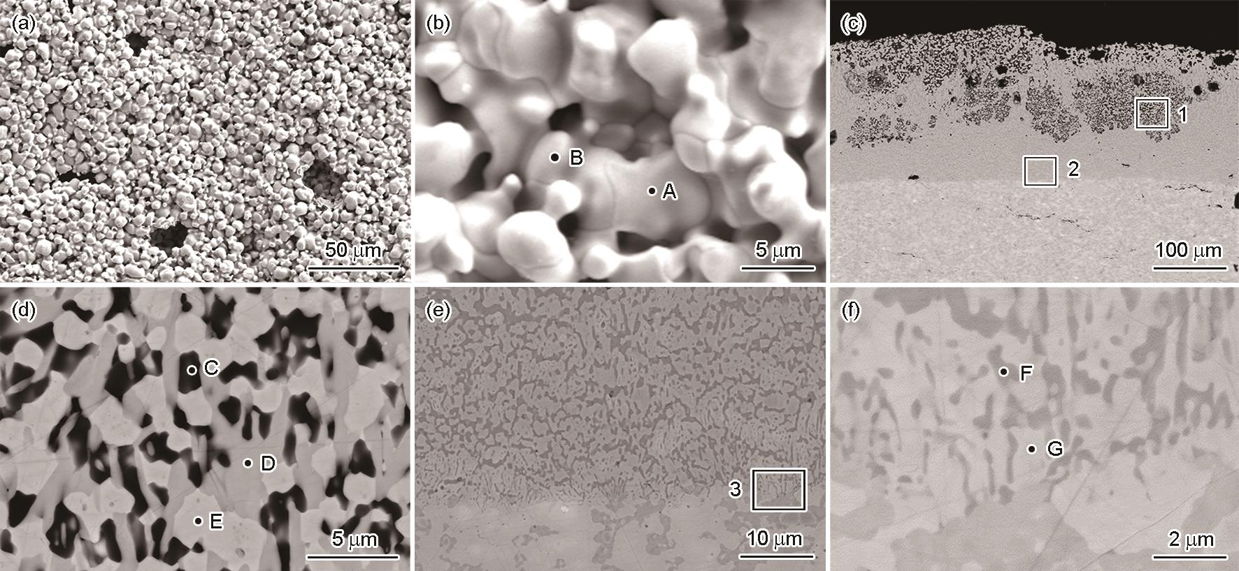 Fig.6 Surface (a, b) and cross-sectional SEM images (c-f) of (La0.2Nd0.2Tm0.2Yb0.2Lu0.2)2Zr2O7 high-entropy ceramic after exposure to molten CMAS at 1300 ℃ for 20 h, Fig.6d, 6e and 6f were high magnification images of region 1, region 2 in Fig.6c and region 3 in Fig.6e, respectively |