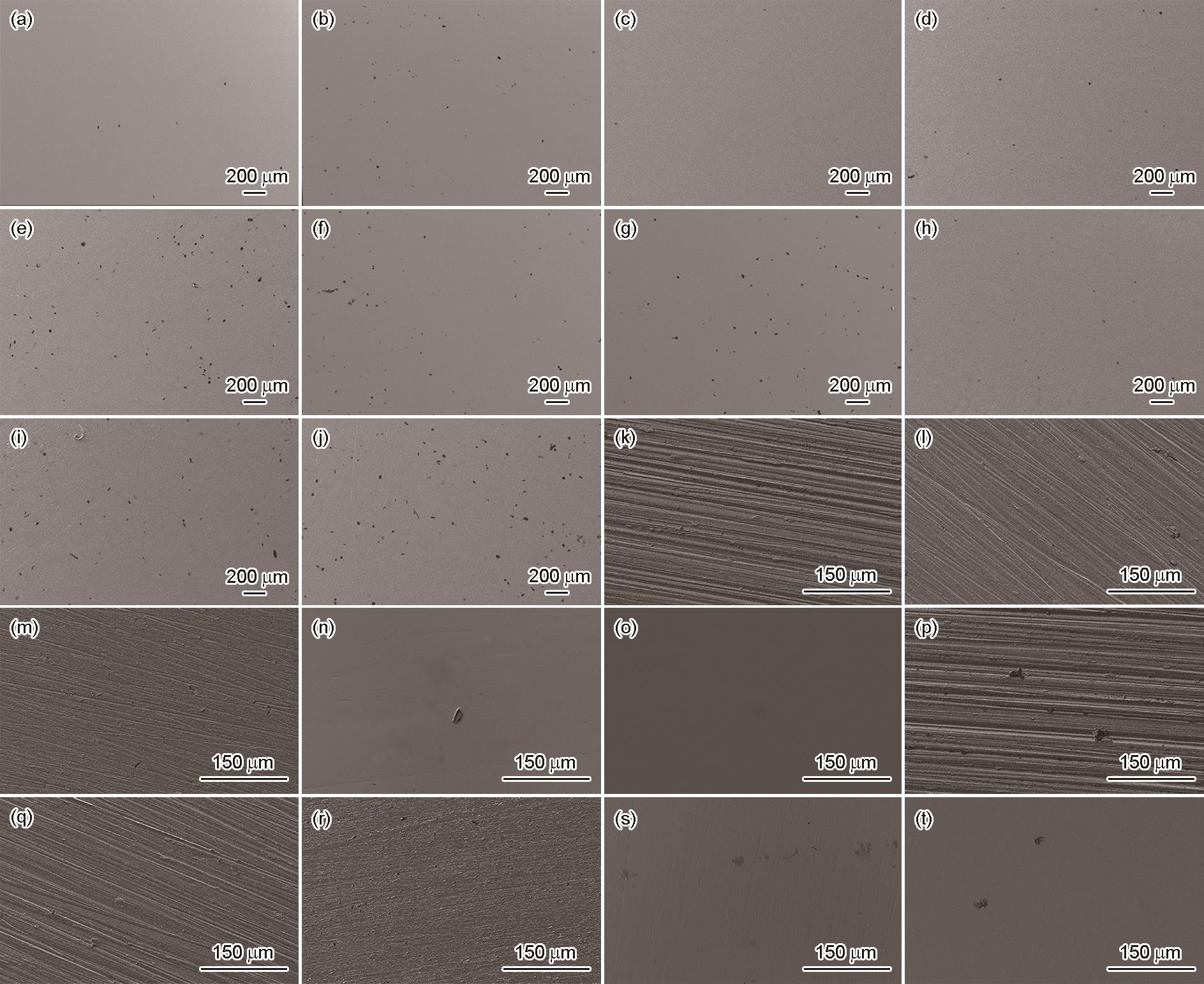 Fig.4 SEM surface images of Vit1 samples with different surface roughness after immersion in NaOH solutions under different conditions of concentration and temperature. 0.01 mol/L at 25 and 35 ℃ (a, b); 0.01 mol/L and 0.1 mol/L (c, h); 0.01 mol/L at 25 and 35 ℃ (d, e); 0.1 mol/L at 25 and 35 ℃ (f, g); 0.1 mol/L at 25 and 35 ℃ (i, j); roughness of 180#, 400#, 1200#, 3000#, 5000# in 0.01mol/L (k-o); roughness of 180#, 400#, 1200#, 3000#, 5000# in 0.1 mol/L (p-t) |
