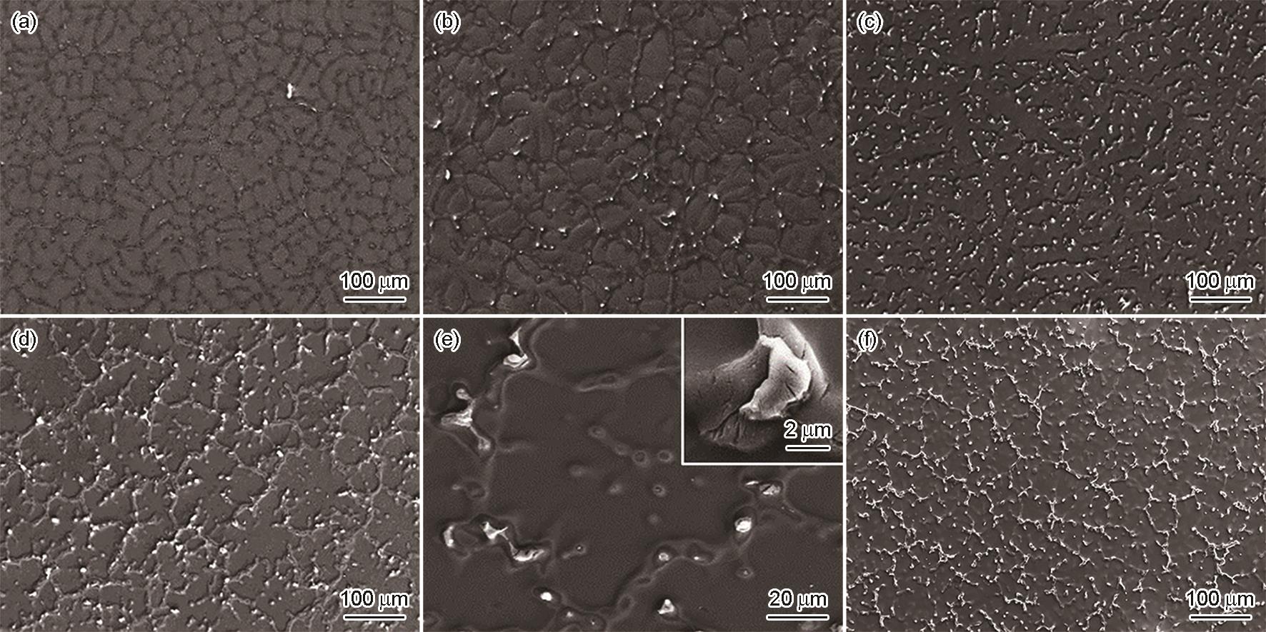 Fig.4 Effect of Al content (mass fraction ) on the microstructure of high-pressure solidified Mg-Al alloys: (a) Mg-3Al, (b) Mg-5Al, (c) Mg-7Al, (d, e) Mg-9Al, (f) Mg-12Al |
