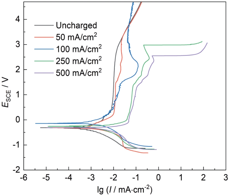 Fig.4 Potentiodynamic polarization curves of titanium substrates uncharged and charged with hydrogen at different cathode current densities |