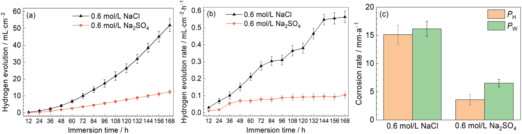 Fig.2 Hydrogen evolution amounts (a), hydrogen evolution rates (b) and average corrosion rates (c) of Mg-10Gd-4Y-2Zn-0.5Zr alloy during immersion in 0.6 mol/L NaCl solution and 0.6 mol/L Na2SO4 solution |