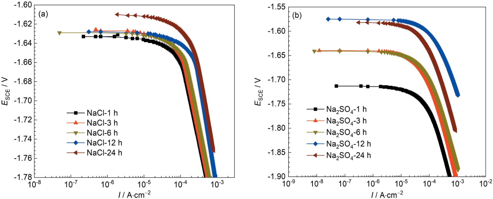 Fig.3 Cathodic polarization curves of Mg-10Gd-4Y-2Zn-0.5Zr alloy after immersion for 1-24 h in 0.6 mol/L NaCl solution (a) and 0.6 mol/L Na2SO4 solution (b) |