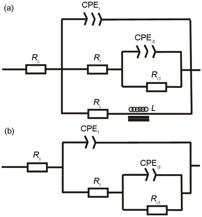 Fig.6 Equivalent circuit diagrams for EIS of Mg-10Gd-4Y-2Zn-0.5Zr alloy during immersion in 0.6 mol/L NaCl solution (a) and 0.6 mol/L Na2SO4 solution (b) |
