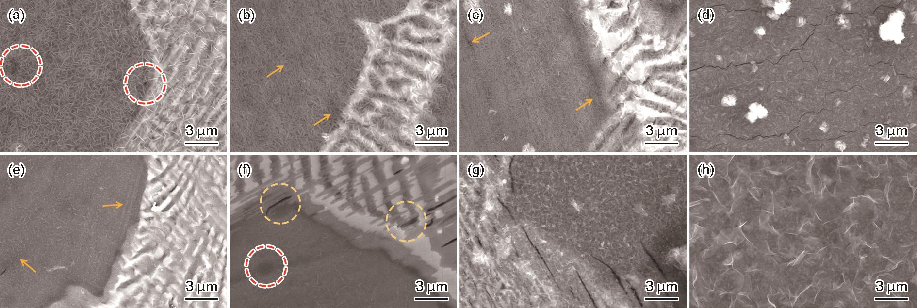 Fig.8 Surface morphologies of Mg-10Gd-4Y-2Zn-0.5Zr alloy immersed in 0.6 mol/L NaCl solution (a-d) and 0.6 mol/L Na2SO4 solution (e-h) for 1 h (a, e), 3 h (b, f), 6 h (c, g) and 24 h (d, h) |